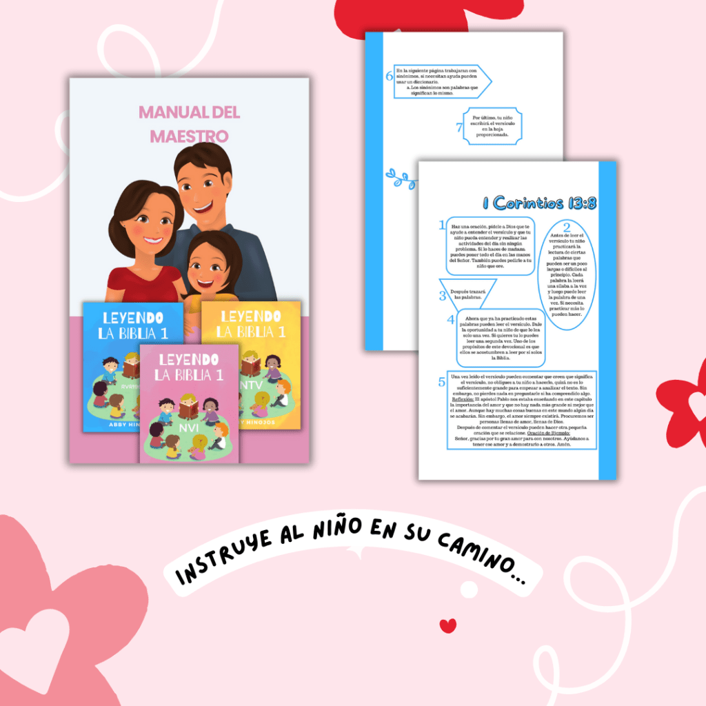 El primero es un manual para el maestro para poder ser usado con un libro llamado Leyendo la Biblia 1. Este manual trae instrucciones y pasos a seguir para que puedas crear un devocional completo con tus hijos usando ese material que puedes encontrar de forma gratuita en mi página hermana: familylifehomeschooling.com. Sigue el enlace y encontrarás más información acerca de ese material.